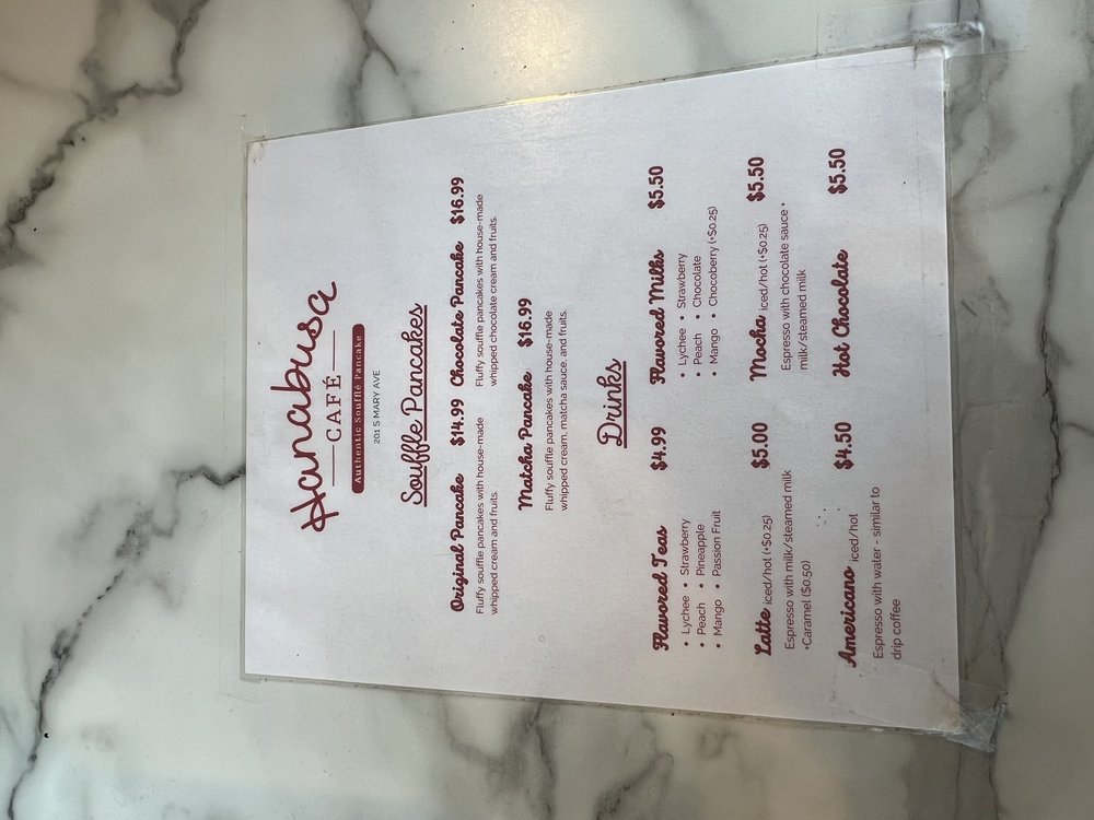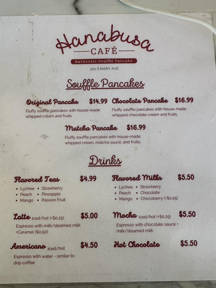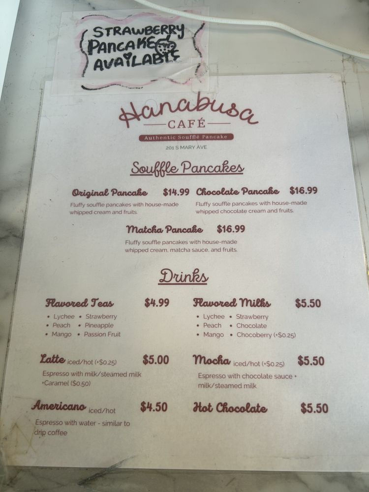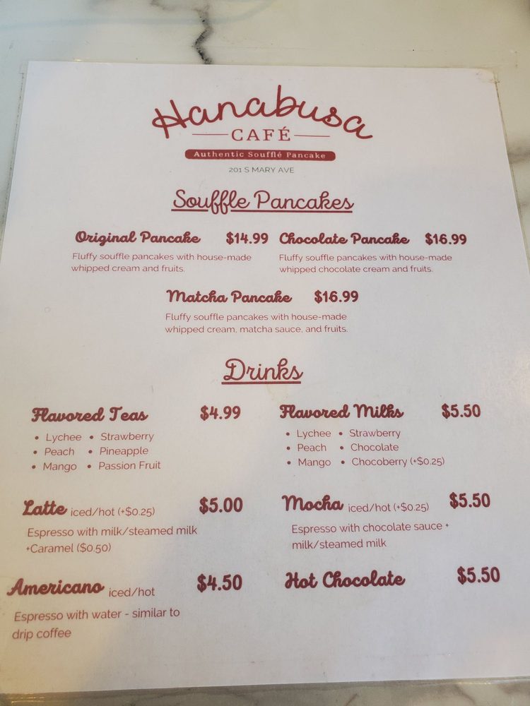 Hanabusa Café, located in Sunnyvale, CA, offers a unique experience with its specialty soufflé pancakes. These fluffy and warm creations come in a variety of flavors such as ube, matcha, strawberry, plain, and chocolate. The ambiance is cozy and welcoming, making it a perfect spot for indulging in delightful desserts. Customers appreciate the attentive service and the option to customize their orders. While the wait time for the made-to-order pancakes can be a bit long, the end result is well worth it. The café's commitment to quality and creativity shines through in each dish, creating a memorable dining experience. Overall, Hanabusa Café stands out for its delicious pancakes, friendly staff, and charming atmosphere, making it a must-visit for dessert lovers in the area.